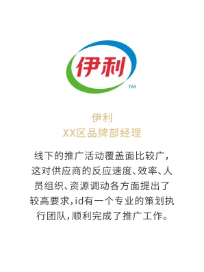 i-d先后經(jīng)歷與Audi、Mercedes-Benz、infiniti、PORSCHE、可口可樂、麥當(dāng)勞、肯德基、Budweiser、華為、小米、中國(guó)移動(dòng)、ELLE、L'OREAL、萬(wàn)達(dá)、仁恒置地、恒大、碧桂園、蘭桂坊...的業(yè)務(wù)合作,成功地將國(guó)際化的營(yíng)銷策劃理念及執(zhí)行方式融入本土,為更多的中國(guó)企業(yè)開啟全新的品牌推廣思路和執(zhí)行方案。